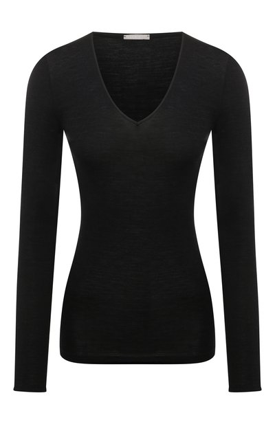 Мастера марки выполнили черный лонгслив из тонкого трикотажа на основе мериносовой шерсти, которая славится своей мягкостью и способностью поддерживать оптимальную терморегуляцию. Чтобы сделать облегающую модель с V-образным вырезом прочнее, в состав включили шелковые волокна.