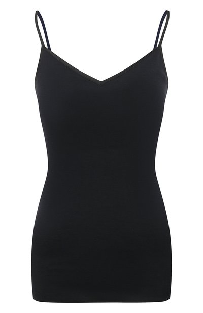 Мастера марки сшили черный топ с V-образным вырезом из тонкого эластичного трикотажа на основе мерсеризованного длинноволокнистого хлопка. Шелковистый нежный материал не раздражает и не перегревает кожу и легко тянется, обеспечивая плотную комфортную посадку и полную свободу движений. Модель с атласными узкими бретелями дополнили съемными чашечками, мягко поддерживающими грудь.