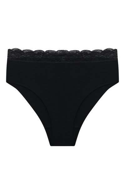 Черные слипы сшили из нежного шелковистого джерси, связанного из мягкого хлопка супима. У него самые длинные и тонкие волокна, отличающиеся особенной прочностью, поэтому дышащий материал, усиленный эластаном, получился легким и приятным на ощупь. Более изысканной модель сделала отделка из кружева на поясе.