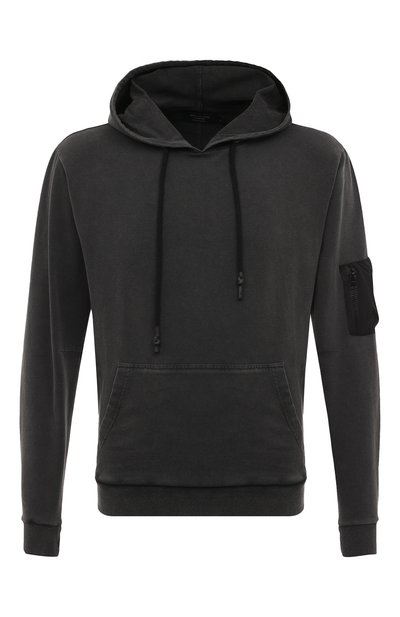 Темно-серое худи мастера бренда сшили из визуально состаренного хлопкового футера с бархатистой изнанкой. Левый рукав дополнен нейлоновым черным карманом и патчем с логотипом марки. Модель с капюшоном, регулируемым кулиской, поддерживает комфортную для тела температуру и не пилингуется.
