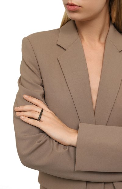 Фигурное кольцо, напоминающее звено цепочки, выглядит предельно лаконичным. Модель, очищенную от декора, мастера марки выполнили из прочного ювелирного сплава, который отполировали до зеркальной гладкости и покрыли черным родием. О принадлежности аксессуара бренду говорит только выгравированный с внутренней стороны логотип.