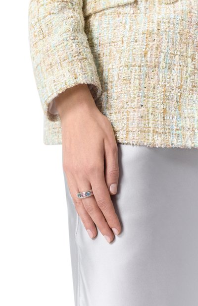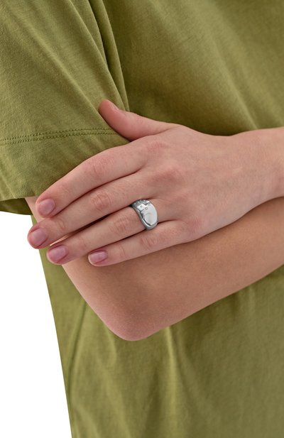 Скульптурное кольцо изготовили из ювелирного сплава, искусно обработанного вручную. На фактурный материал нанесли гальваническое покрытие черным родием, которое не потускнеет со временем и не покроется царапинами. С его холодным сиянием рифмуется блеск серого кристалла, отражающего свет множеством отполированных граней.