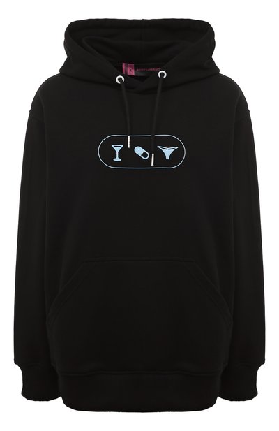 Мастера марки сшили черное свободное худи, украшенное голубым графичным принтом, из мягкого, в меру плотного трикотажа. Крой не сковывает движения, а хлопковый материал хорошо пропускает воздух, и удерживает тепло, поэтому в такой модели будет особенно комфортно в прохладный день.