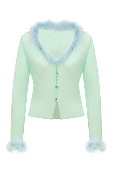 Дизайнеры марки при создании укороченного бирюзового топа, напоминающего кардиган, сыграли на контрасте фактур. Для пошива модели использовали тонкий полупрозрачный материал. Глубокий V-образный вырез и края рукавов подчеркнули отделкой из густых пушистых перьев.