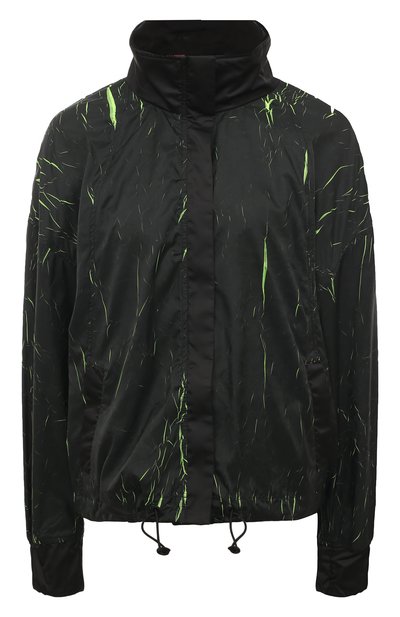 Для пошива темно-зеленой ветровки с высоким воротником мастера марки использовали шелковистый непродуваемый полиэстер с имитацией кракле. Мотив, напоминающий тонкие трещины, подчеркнули ярким салатовым оттенком. Пояс дополнили кулиской, сделав его регулируемым. Сзади модель силуэта oversize украсили крупным брендированным патчем.