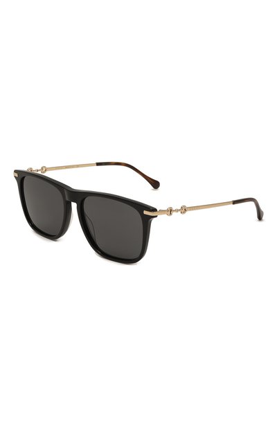 Солнцезащитные очки квадратной формы одинаково гармонично будут смотреться и на мужском, и на женском лице. При создании модели использовали материалы разной фактуры. Черную рамку и черепаховые заушники выполнили из легкого прочного ацетата, дужки со вставкой в виде пряжки Horsebit — из тонкого металла с золотистым покрытием. Темны е линзы на 100% блокируют УФ-лучи.