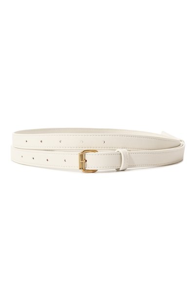 Узкий ремень молочного оттенка мастера бренда выполнили из прочного гладкого материала, внешне напоминающего кожу. Длина аксессуара позволяет обернуть его дважды вокруг талии. Модель застегивается золотистой металлической пряжкой, отполированной до глянцевого блеска.