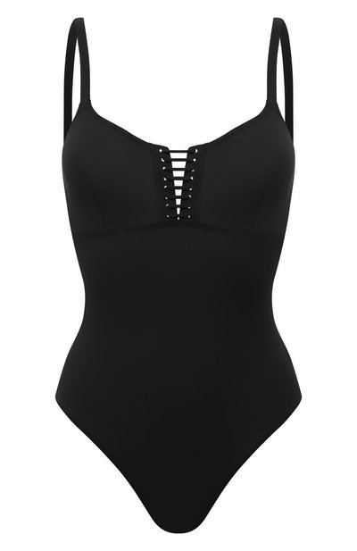 Слитный черный купальник с узкими бретелями сшит из гладкого матового материала, который отлично пропускает воздух, быстро высыхает после намокания и создает легкий моделирующий эффект. Формованные чашечки с корсетной шнуровкой обеспечивают комфортную поддержку груди.