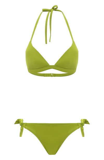 Для пошива раздельного купальника сочного оттенка спелого киви мастера марки использовали фирменный эластичный материал, который быстро сохнет и не выцветает на солнце. Бра с треугольными чашечками, дополненными формованными вставками, обеспечивает оптимальную поддержку груди, а посадку бикини удобно регулировать завязками по бокам.