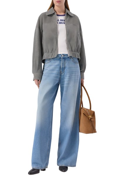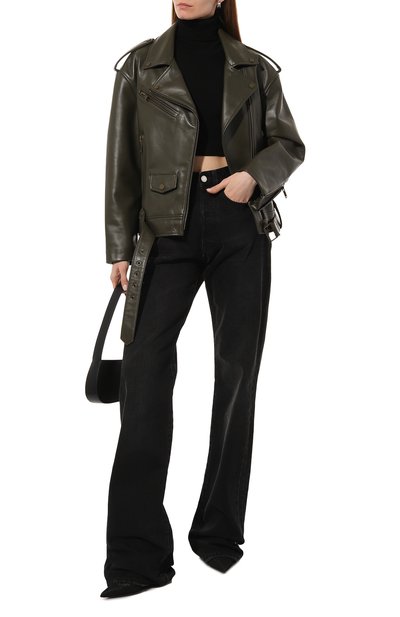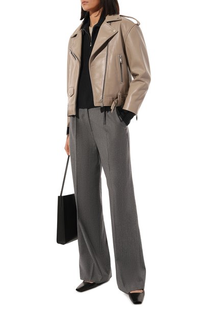 Единственным спецэффектом косухи со спущенной линией плеч стало глянцевое сияние отполированной мягкой кожи, которое в сочетании с серым цветом имитирует металлизированное покрытие. Материал выделали вручную, сделав более пластичным, поэтому куртка с широким лацканами и множеством молний, в том числе и на рукавах, не сковывает движения. Изделие дополнили регулируемым поясом с пряжкой.