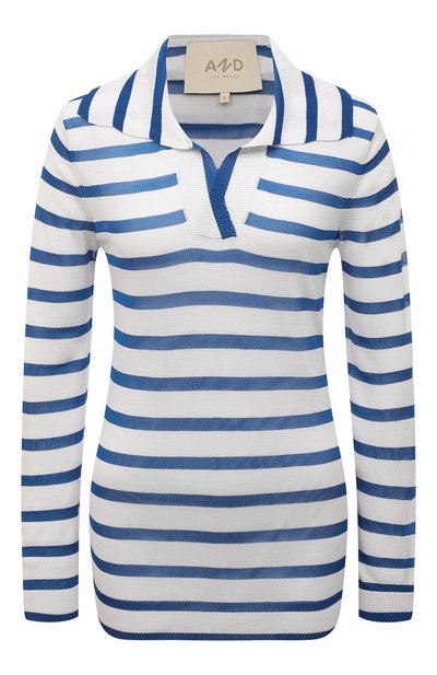 Для изготовления свободного пуловера в голубую горизонтальную полоску мастера марки использовали ультратонкую шелковистую вискозу. У нее гладкие и мягкие волокна, поэтому модель с длинными рукавами почти не ощущается на теле и идеально пропускает воздух. Изделие с отложным воротником дополнили V-образным вырезом, как у поло.