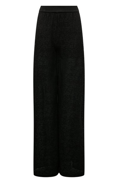 Черные широкие брюки в пол сшиты из тонкого вискозного трикотажа с крупными узорами в виде логотипов марки и легким мерцающим блеском. Наши стилисты предлагают сочетать полупрозрачную эластичную модель с белой рубашкой, коричневым блейзером и босоножками в тон.