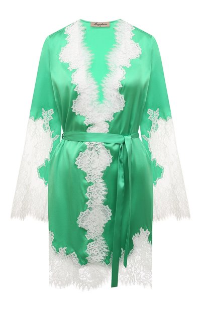 Нежные розы из французс ких садов стали ажурным узором на коротком халате с узким поясом-лентой. Хрупкость цветов передает белое кружево Кале, которое делает модель полупрозрачной внизу, вдоль выреза и на рукавах. Материалу в тонкости почти не уступает эластичный шелковый сатин насыщенного зеленого оттенка, позаимствованного у листьев и стеблей.