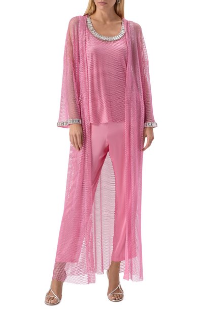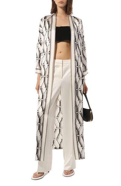 Длинную черную накидку с ярким разноцветным принтом на фоне графического паттерна Юлия Янина стилизовала под халат с широкими рукавами. Модель с полосатым кантом по краям сшили из тонкого мягкого хлопка, который едва ощущается на теле и в котором не будет жарко в теплый день. Пояс-лента помогает регулировать глубину запаха и подчеркивает талию.