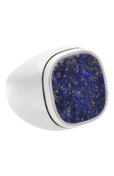 Для изготовления крупного кольца использовали прочное серебро 925 пробы. Матовая, отполированная до гладкости поверхность не отвлекает внимания от сияющей квадратной печатки, инкрустированной синим лазуритом с уникальным природным узором. Ее форму подчеркнули гравировкой по краю, придав эффект многослойности.