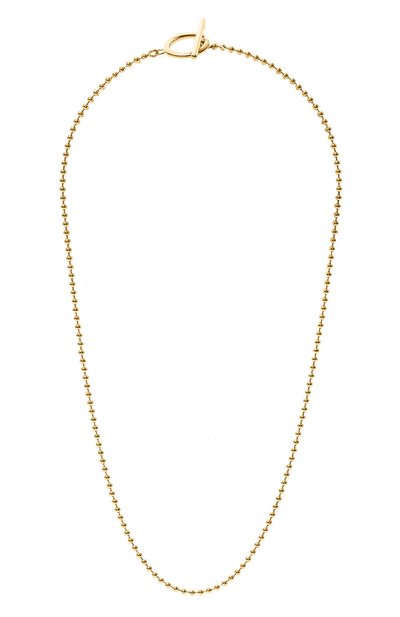 Почти невесомое длинное колье-цепочка жемчужного плетения будет уместно даже в самом лаконичном образе. Украшение изготовлено вручную из гипоаллергенного ювелирного сплава, покрытого позолотой. Крупная застежка-тогл может стать хорошей альтернативой подвеске, если разместить ее на груди.