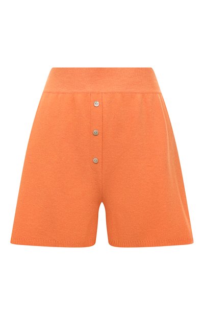 Оранжевые шорты с декоративными пуговицами спереди напоминают мужские боксеры, но материал делает их комфортнее. Модель связали из шелковистой вискозы, которая хорошо пропускает воздух и приятно ощущается на коже. Широкий пояс мягко ложится на талию и не давит на живот.