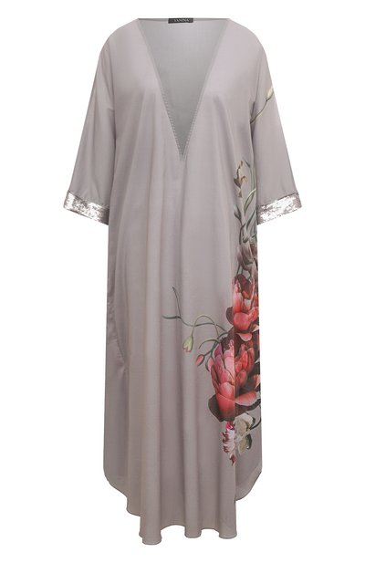 Юлия Янина, создавая серую длинную тунику, умело сочетала провокацию и романтичность. За первое отвечает экстремально глубокий V-образный вырез, а за второе — крупный цветочный принт. Для изготовления свободной струящейся модели использовали тонкий легкий хлопок. Манжеты расшили сверкающими серебристыми пайетками.