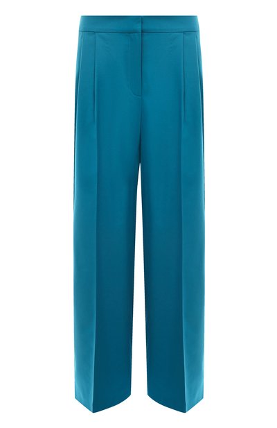 Алена Ахмадуллина выбрала для пошива бирюзовых широких брюк мягкую тонкую шерсть с добавлением почти невесомых волокон кашемира. Ткань отлично пропускает воздух и сохраняет тепло, поддерживая комфортный для тела микроклимат, а стрелки визуально вытягивают силуэт. Наши стилисты предлагают сочетать эту модель с кремовым поло и черными шлепанцами.