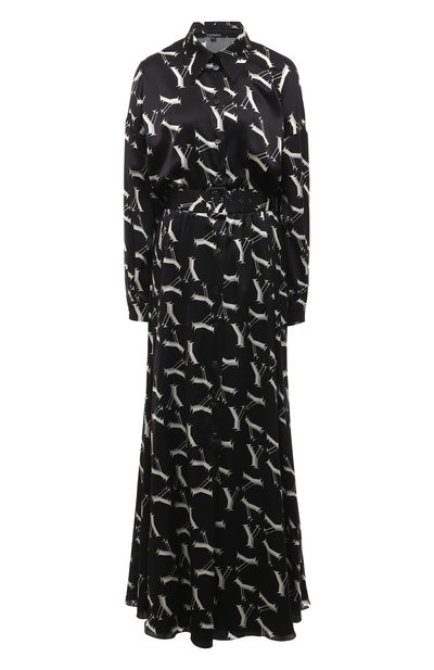 Черное приталенное платье-рубашка с длинными рукавами и отложным воротником дополнено широким съемным поясом с пряжкой. Юлия Янина выбрала для пошива легкой модели гладкий шелковый атлас с белыми логотипами марки. Предлагаем создать образ с мюлями и сумкой в тон.