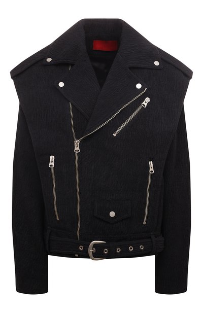 Черную косуху переосмыслили в новом материале. Вместо привычной кожи для пошива куртки с акцентированными плечами и множеством молний использовали прочную эластичную ткань бифлекс с жатой фактурой. Такая модель с широким лацканами не продувается ветром и защищает от небольшого дождя. Пояс дополнили регулируемым ремнем с фигурной пряжкой.