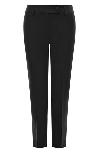 Черные брюки со стрелками станут комфортной базой для разных образов в стиле casual. Для пошива прямой модели дизайнеры марки выбрали облегченный костюмный материал, который хорошо держит четкость линий кроя и почти не мнется. Укороченная длина брючин позволяет продемонстрировать изящные щиколотки.