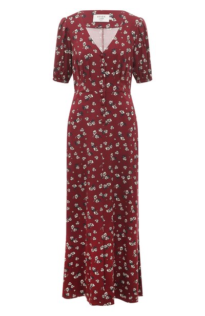 Длинное бордовое платье с пуговицами на лифе выглядит женственным. На это играют и мелкий цветочный принт, и объемные короткие рукава, и приталенный крой с разрезом на подоле спереди, открывающим ноги в движении. Для пошива модели мастера марки использовали тонкую мягкую вискозу, которая почти не мнется и едва ощущается на теле.