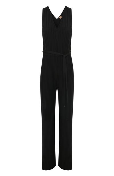 Черный комбинезон без рукавов удачно дополнит повседневный гардероб, а с правильными аксессуарами станет основой для праздничного образа. Наши стилисты предлагают сочетать модель с яркими босоножками на каблуках и вечерней сумкой на тонкой цепочке. Торжественное сияние деталей поддержит мягкий блеск струящейся плиссированной вискозы, укрепленной гладкими искусственными нитями.