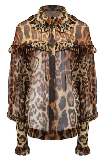 Почти невесомую блузу мастера марки сшили из полупрозрачного шелкового шифона с леопардовым мотивом. Яна Расковалова противопоставила объемные скульптурные рукава гипертрофировано широким манжетам с оборками. Такими же элементами подчеркнули отложной воротник и кокетку спереди и сзади.
