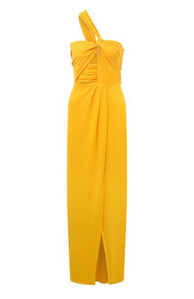 К созданию желтого платья Патриция Бамби отнеслась как к головоломке, отдав предпочтение сложносочиненному крою. Такой подход помог сформировать мягкие драпировки, подчеркивающие струящийся силуэт. Для пошива модели с запахом, открывающим ноги при ходьбе, использовали легкий тонкий текстиль.