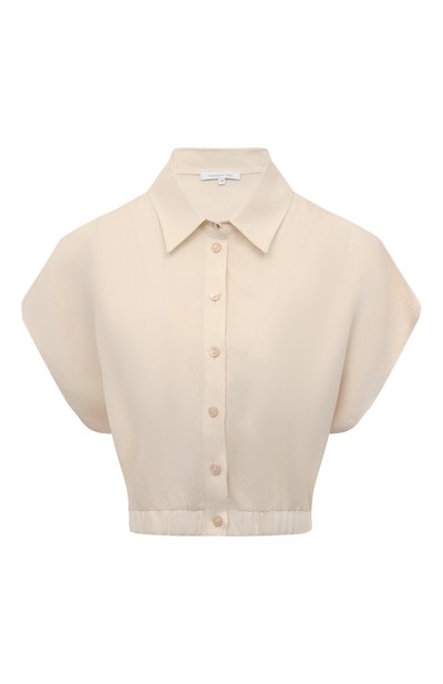 Бежевой рубашке с отложным воротником Патриция Бамби добавила расслабленности, сделав мягкой линию плеч и лишив рукавов. Для пошива модели использовали нежный, приятный на ощупь поплин, хорошо пропускающий воздух и поддерживающий комфорт для тела в жаркую погоду. Низ укороченного изделия дополнили эластичным поясом, сформировав акцентированно приталенный силуэт.