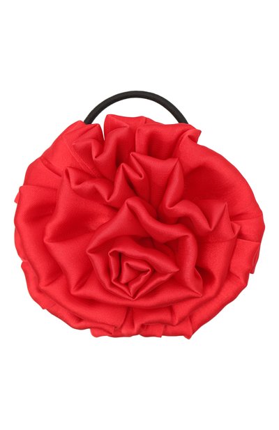 Резинка из плотного эластичного текстиля удержит локоны в хвосте или косе, не травмируя и не спутывая волосы. Аксессуар украсили крупным алым цветком, собранным мастерами марки вручную из широкой атласной ленты с характерным блеском.
