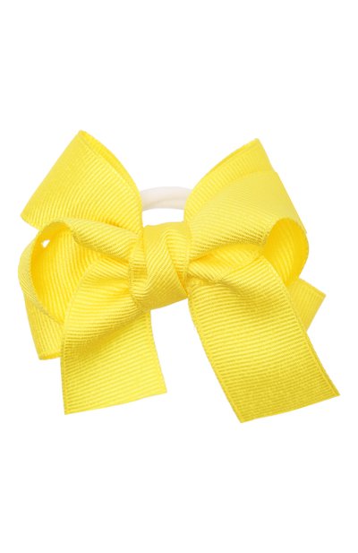 Мастера марки выполнили резинку из мягкого эластичного текстиля. Материал плотно удерживает волосы, но при этом не повреждает их. Изделие украсили крупной лимонно-желтой аппликацией в виде объемного банта, сформированного из широкой ленты грогрен.