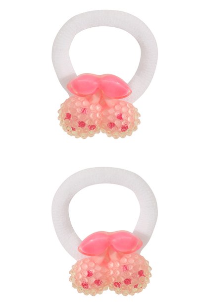 Кипенно-белая резинка из мягкого текстиля надежно фиксирует волосы в прическе, не повреждая их и не раздражая кожу головы. Аксессуар украшен розовой пластиковой аппликацией в виде пары фирменных вишен. В комплект входит еще одно точно такое же изделие.