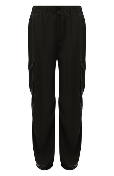 Черным джоггерам привили гены карго, дополнив брючины характерными карманами. Для пошива изделия с эластичным поясом использовали шелковистую плотную ткань. Эффект от свободного кроя усилили, сформировав в зоне колен защипы, создающие мягкие складки. Сзади модель украсили крупной контрастной надписью.