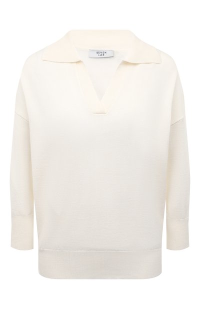 Молочно-белый пуловер с V-вырезом и отложным воротником команда марки стилизовала под поло. Модель со спущенной линией плеч и рукавами 3/4 связали из легкой тонкой пряжи на основе нежной вискозы и тонкого хлопка, адаптировав ее для прогулок в теплое время года. Наши стилисты предлагают дополнить изделие свободными брюками и кедами.