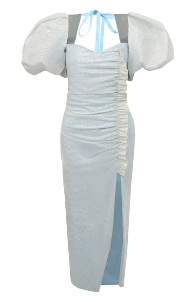 Голубое платье деликатно сияет под лучами света. Блики создает глиттер, придающий оттенку модели холодный ледяной блеск. Для пошива изделия с объемными короткими рукавами Евгения Ким выбрала шелковистый текстиль. Фигурное декольте поддержали слегка открытой спиной и высоким разрезом на подоле слева, вертикаль которого продолжает широкая оборка.