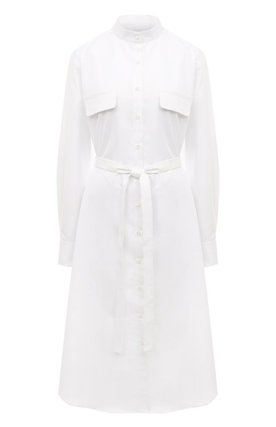 Белое платье-рубашку стилизовали под одежду в стиле сафари с помо щью воротника-стойки и накладных карманов с клапанами. Для пошива модели использовали тонкий легкий хлопок поплин, который хорошо пропускает воздух и почти не мнется. Выполненный из такого же материала пояс-лента формирует приталенный силуэт.