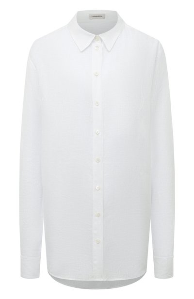 Белая рубашка с отложным воротником и длинными рукавами выглядит так, словно ее одолжили в мужском гардеробе. Свободную модель со спущенной линией плеч сшили из легкого тонкого льна, обладающего терморегулирующими и антибактериальными свойствами. Такая ткань не впитывает посторонние запахи, поэтому изделие сохранит ощущение свежести на весь день.
