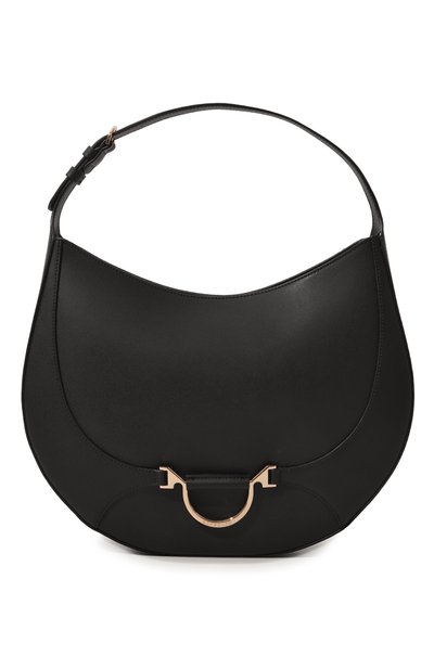 Черную сумку хобо 110 мастера марки сшили из гладкой мягкой кожи с легким блеском. Модель, которую удобно носить и в руке, и на плече, декорировали на передней панели крупной золотистой пряжкой в виде стремени. В основное отделение, закрывающееся молнией сверху, поместятся планшет, складной зонт, кошелек и футляр с очками.