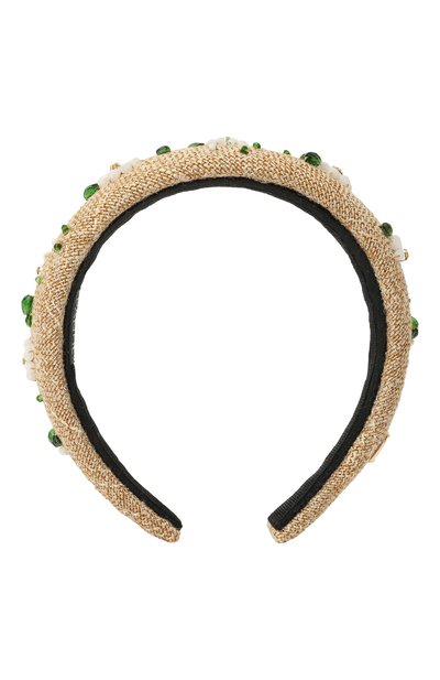 Широкий бежевый ободок словно сплели из тонкой соломы. Такой эффект создает выразительная неоднородная фактура текстиля. Его поверхность покрыли луговыми ромашками из молочно-белых и зеленых бусин и зо лотистых кристаллов. Гибкую основу аксессуара изготовили по авторской технологии, которая позволяет регулировать объем для комфортной посадки на голове.