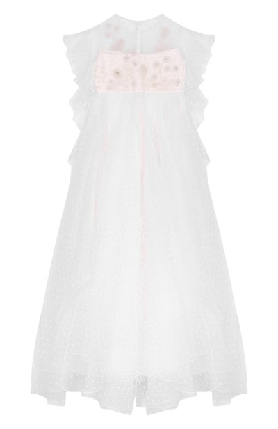 Это бело-голубое платье выглядит воздушным. Такое впечатление создает почти невесомый полупрозрачный тюль с эффектом плиссировки, а поддерживают лиф со сложносочиненной драпировкой и пышный подол-баллон. Чтобы сделать модель наряднее, вырез, рукава и пояс декорировали бархатными синими шнурами, завязанными бантом.