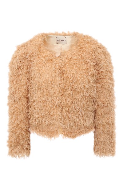 Создавая укороченный бежевый жакет, дизайнеры марки изменили привычный подход к выбору материала. Для пошива изделия с круглым вырезом использовали фактурный вискозный текстиль, словно расшитый тонкими легкими перьями. Чтобы не перегружать образ, предлагаем носить модель с лаконичными джинсами и лоферами.