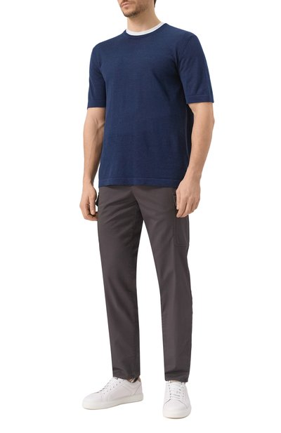 Ярко-синий джемпер с короткими рукавами можно принять за футболку, а его легкий трикотаж – за шелковое джерси. Деликатный блеск модели придает отборная шерсть с особенно тонкими и гладкими волокнами. Столь нежный материал остается почти неощутимым на теле и при этом помогает поладить с вечерней прохладой.