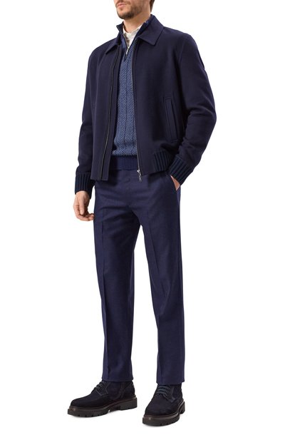 Отточенный зауженный крой и графичные стрелки помогут этим брюкам стать отличной основой для образа в стиле smart casual. Строгость модели усиливает темный оттенок синего, в который окрасили гладкую костюмную шерсть. Чтобы изделие осталось по-итальянски легким и мягким, для ткани отобрали сырье с тонкими волокнами и соединили его с нежным мохером.