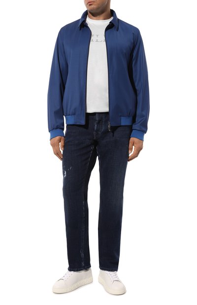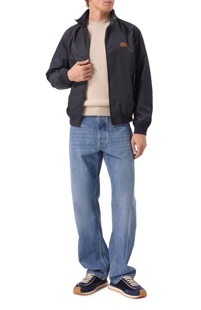 Синему однотонному бомберу прямого кроя привили гены спортивной одежды, дополнив его поясом, манжетами и воротником-стойкой из эластичного трикотажа в полоску. Для пошива модели использовали гладкий прочный шелк с характерным атласным блеском, поддерживающий комфортную для тела температуру. О принадлежности бренду говорит небольшой белый логотип слева на груди.