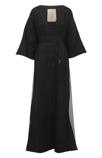 Черное макси-платье, стилизованное под кимоно, сшили из мягкой тонкой ткани, в которой соединили нити хлопка и льна. Спинку модели с широкими рукавами украсили аппликацией в виде спирали, выполненной вручную из текстильных лент и минералов. Муаровый эффект изделию придали, продублировав слоем полупрозрачного тюля. В комплекте — фигурный пояс-лента, удерживающий запах.