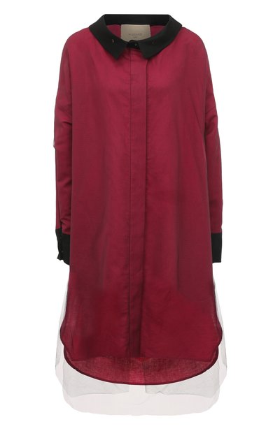 Для пошива бордового свободного платья с черными отложным воротником и манжетами использовали тонкую хлопковую ткань с добавлением гладкого льна. Материал хорошо пропускает воздух и обладает терморегулирующими свойствами, поэтому в модели будет комфортно весь день. Характерный для вещей марки чехол из полупрозрачного тюля создает на поверхности изделия с потайными пуговицами спереди муаровый эффект.
