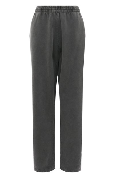 Темно-серые брюки максимально свободного кроя унаследовали от джинсов потертости вдоль швов и на эластичном поясе. Светлые разводы нанесены не на деним, а на более мягкий трикотаж из чистого хлопка. Команда марки сделала материал достаточно плотным, чтобы в модели было комфортно в прохладную погоду.