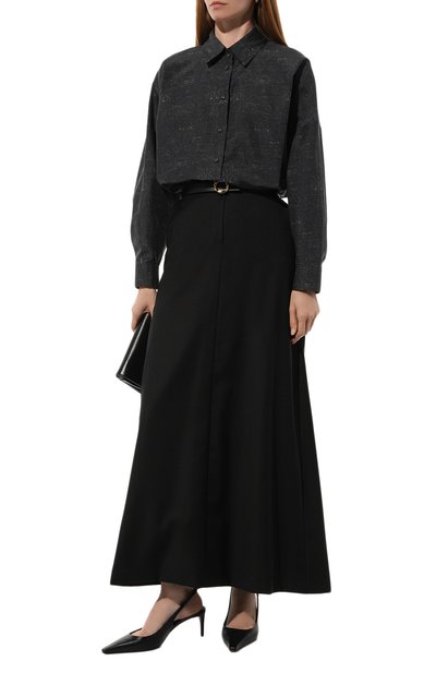 Черный цвет и лаконичный крой не сделали макси-юбку простой. Провокации модели с узким поясом и классической посадкой добавили диагональные разрезы, демонстрирующие бедра. Изделие с высокой шлицей сзади сшили из мягкого хлопкового твила с включением стрейчевых волокон.